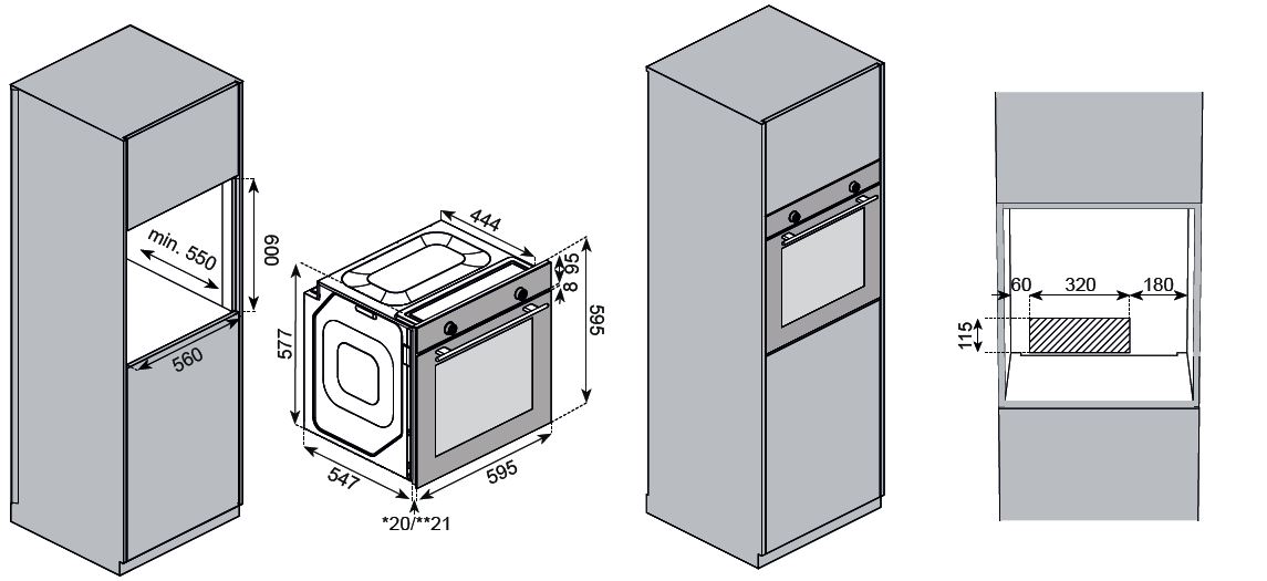 Габариты духовки составляют 59.5 × 59.5 × 56.5 см. Для установки предусмотрена ниша размером 600 × 560 × 550 мм. Внутренний объем камеры достигает 80 литров, что позволяет готовить крупные блюда и использовать несколько уровней одновременно.